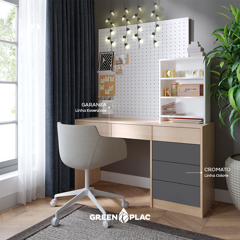 Moderno, urbano e sóbrio: Cromato traz harmonia e personalidade para os ambientes através da sua tonalidade que elegante e sofisticada. O cinza é um clássico e permite tanto a composição de espaços ousados e expressivos, como sofisticados e imponentes. Pode ser o padrão predominante e em destaque, mas também um coadjuvante em combinações com outros materiais madeirados e linheiros.